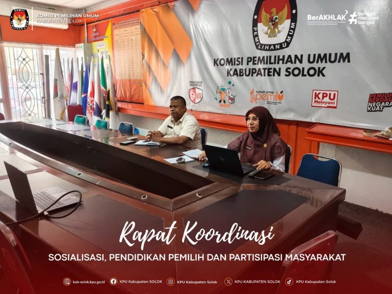 #TemanPemilih, KPU Kabupaten Solok ikuti Rapat Koordinasi Sosialisasi, Pendidikan Pemilih, dan Partisipasi Masyarakat yang diadakan oleh KPU Provinsi Sumatera Barat melalui zoom meeting, Kamis (9/10/2025). Kegiatan ini dubuka oleh Ketua KPU Provinsi Sumatera Barat Surya Efitrimen, dalam arahannya menyampaikan bahwa sekarang merupakan masa non tahapan kegiatan sosialisasi berkelanjutan tetap dilaksanakan walaupun dengan keterbatasan anggaran. Dalam rakor ini pemahasan difokuskan pada digitasisasi sosialisasi melalui website dan media sosial, kolaborasi dengan sekolah, stakeholder terkait, kampus dan komunitas yang ada pada daerah, pendekatan budaya dan bahasa daerah agar pesan lebih sampai kepada masyarakat. Dan selanjutnya adalah persiapan presentasi keterbukaan informasi publik, untuk KPU Kabupaten/Kota akan dilaksanakan pada tanggal 14 dan 15 Oktober 2025. #KPUelayani #KPUKabupatenSolok ....