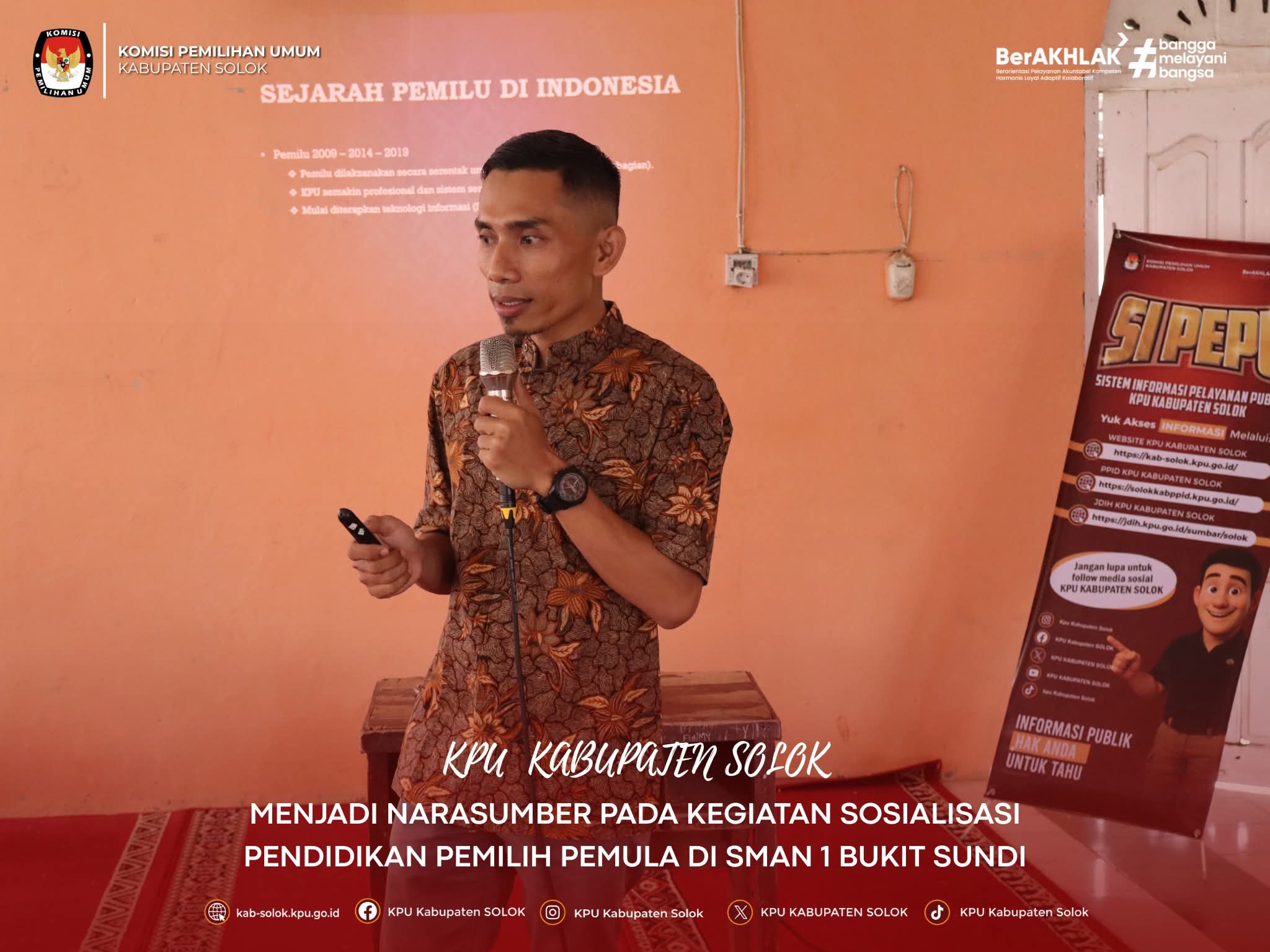 #TemanPemilih, Ketua Divisi Sosisdiklih Parmas dan SDM KPU Kabupaten Solok Novialdi Putra menjadi narasumber Sosialisasi Pendidikan Pemilih Pemula di SMAN 1 Bukit Sundi Jumat, 17 Oktober 2025.