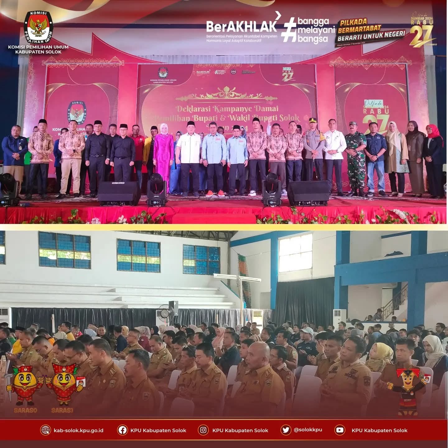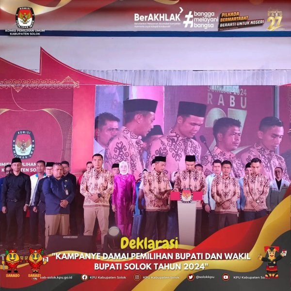 #TemanPemilih, KPU Kabupaten Solok melaksanakan Deklarasi Kampanye Damai Pemilihan Bupati dan Wakil Bupati Solok Tahun 2024 di Sport Hall Batu Batupang Koto Baru, Solok pada hari Selasa tanggal 24 September 2024.