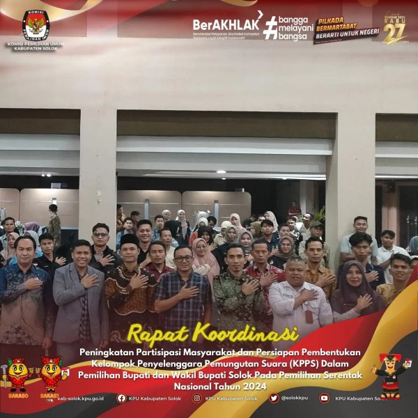 Selanjutnya Hasbullah juga berpesan melalui Rapat Koordinasi ini agar setiap penyelenggara terus melakukan, menggencarkan kegiatan sosialisasi sehingga partisipasi masyarakat kabupaten Solok pada Pilkada 27 November mendatang lebi tinggi dari sebelumnya, juga Hasbullah meminta kepada PPK dan PPS untuk bekerja secara Kolektif Kolegial, terlebih mulai tanggal 17 hingga 28 September ini merupakan masa pendaftaran pembentukan KPPS.