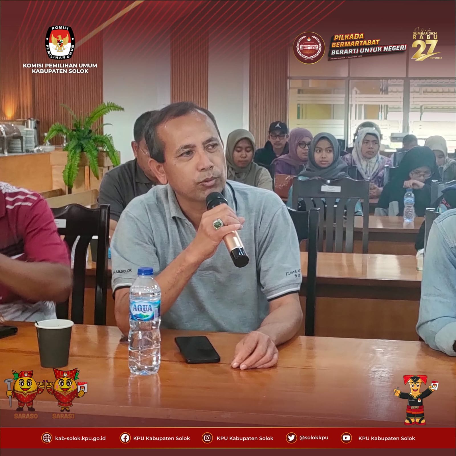 TemanPemilih, KPU Kabupaten Solok melaksanakan kegiatan Jumpa Pers Tahapan Pencalonan Bupati dan Wakil Bupati Solok Tahun 2024 bertempat di Aula D'Relazion, Senin 26 Agustus 2024 bersama para Insan Pers se Kabupaten Solok dari berbagai media.