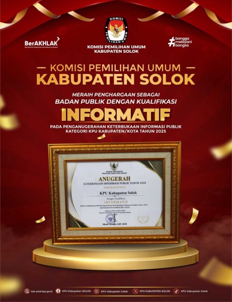 KPU Kabupaten Solok meraih predikat INFORMATIF untuk kategori Instansi Pemerintah Vertikal dalam pelaksanaan Monitoring dan Evaluasi Keterbukaan Informasi Publik. KPU Kabupaten Solok akan terus menunjukkan komitmennya dalam memberikan pelayanan informasi publik yang terbuka, akuntabel dan mudah di akses.