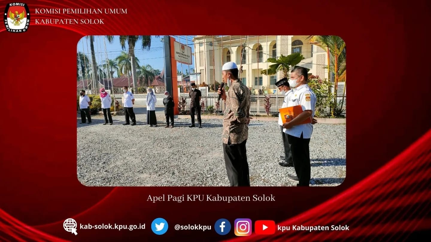#TemanPemilih, Senin 04 April, Komisi Pemilihan Umum Kabupaten Solok melaksanakan apel Senin pagi bertempat di lapangan kantor KPU Kabupaten Solok. Kegiatan apel pagi ini merupakan apel pagi perdana di awal bulan ramadhan 1443 H. Rangkaian kegiatan apel pagi terdiri dari penghormatan bendera diiringi lagu Indonesia Raya, Pembacaan Pancasila, Pembacaan UUD 1945, Pembacaan Panca Prasetya Korps Pegawai Republik Indonesia dan Pengarahan dan pembacaan doa.