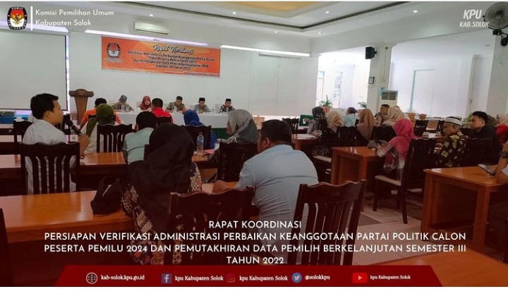 Setelah dilakukan Verifikasi Administrasi keanggotaan Partai Politik Calon Peserta Pemilu tahun 2024 yang dilakukan oleh KPU Kabupaten Solok sejak tanggal 16 Agustus s/d 10 Setember 2022, selanjutnya KPU Kabupaten Solok akan memverifikasi data perbaikan , maka sebelum dilakukan verifikasi administrasi perbaikan KPU Kab Solok melaksanakan kegiatan rapat koordinasi mengenai persiapan verifikasi administrasi perbaikan keanggotaan partai politik calon peserta pemilu 2024 dan pemutakhiran data pemilih berkelanjutan semester III tahun 2022 pada tanggal 30/09/2022 di D'Relelazion Solok. Kegiatan ini diikuti oleh Dandim 0309 Solok, Polres Solok, Polres Solok Kota, Bawaslu Kab Solok, Kesbangpol Kab Solok, Disdukcapil Solok, Dinas PMN Solok, Lapas Kelas IIB Solok, Cabang Dinas Pendidikan Solok, dan Partai Politik calon peserta pemilu tahun 2024 se Kabupaten Solok. Dalam kesempatan ini Divisi Perencanaan Data dan Informasi Jons Manedi menyampaikan mengenai data pemilih per September 2022 sebanyak 276.199 pemilih dengan jumlah pemilih TMS kategori meninggal sebanyak 61 orang.