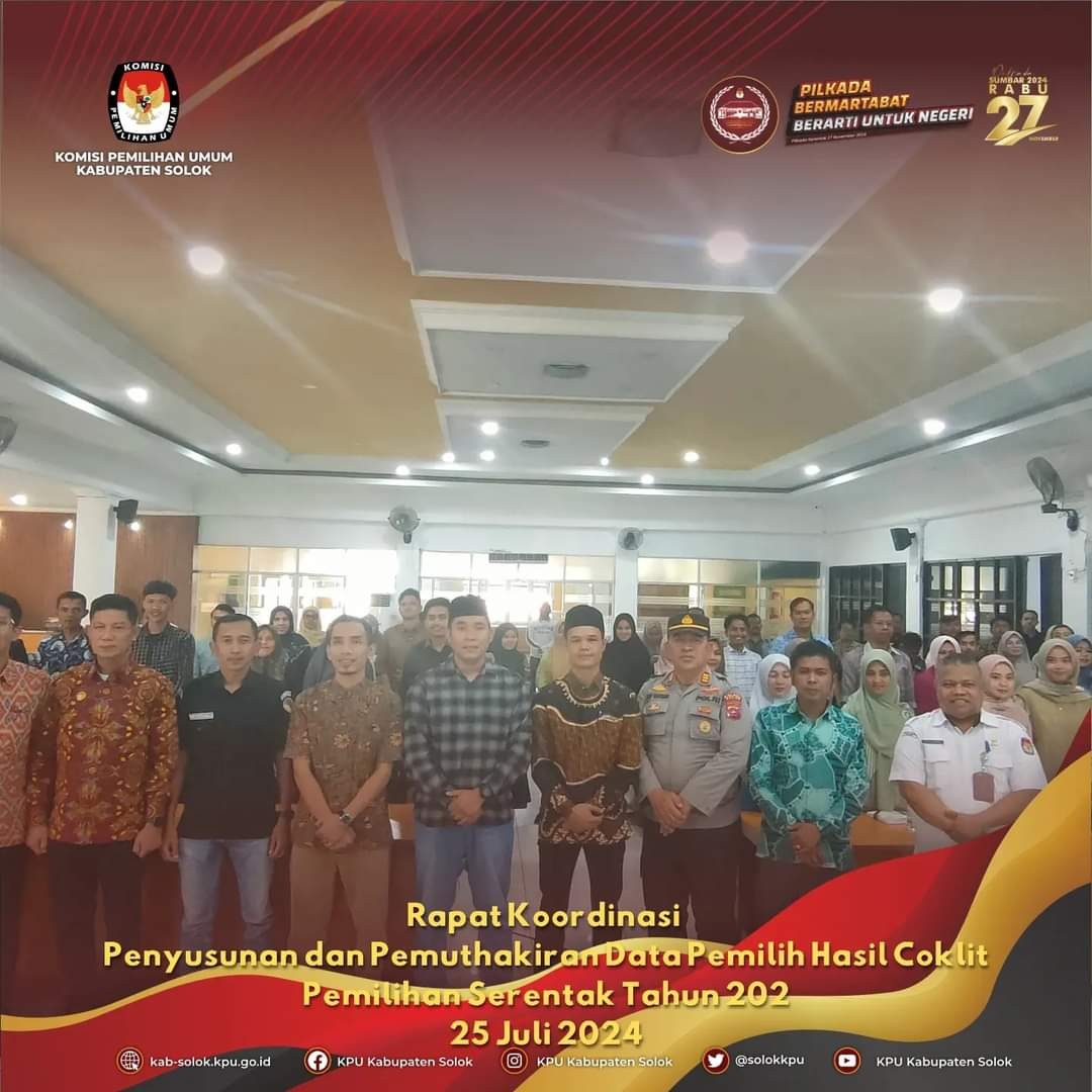 #TemanPwmilih, Komisi Pemilihan Umum Kabupaten Solok gelar Rapat Koordinasi Penyusunan dan Pemuthakiran Data Pemilih Hasil Coklit Pantarlih bersama PPK se-Kabupaten Solok, bertempat di Aula D'Relazion Solok, 25 Juli 2024.