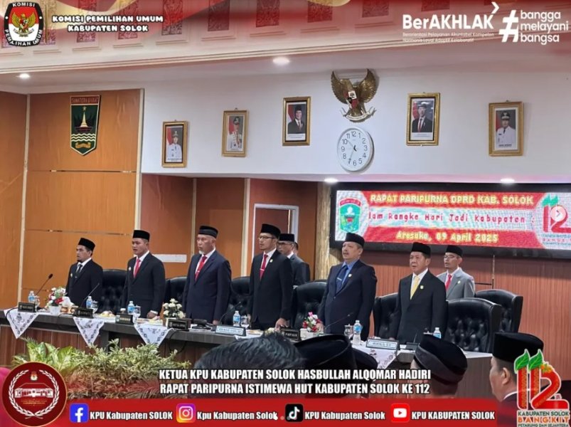 #TemanPemilih, Ketua KPU Kabupaten Solok Hasbullah Alqomar menghadiri Rapat Paripurna Istimewa DPRD Kabupaten Solok dalam rangka Hari Ulang Tahun Kabupaten Solok yang ke 112, Rabu 09 april 2025 bertempat di ruang rapat DPRD, Arosuka.