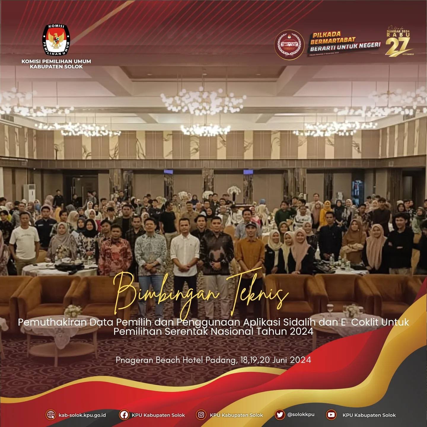 #TemanPemilih, KPU Kabupaten Solok melaksanakan Bimbingan Teknis Pemutakhiran Data Pemilih, Penggunaan Aplikasi Sidalih dan E-Coklit untuk Pemilihan Serentak Nasional Tahun 2024 kepada Badan Adhoc, bertempat di Hotel Pangeran Padang tanggal 18 s.d 20 Juni 2024.
