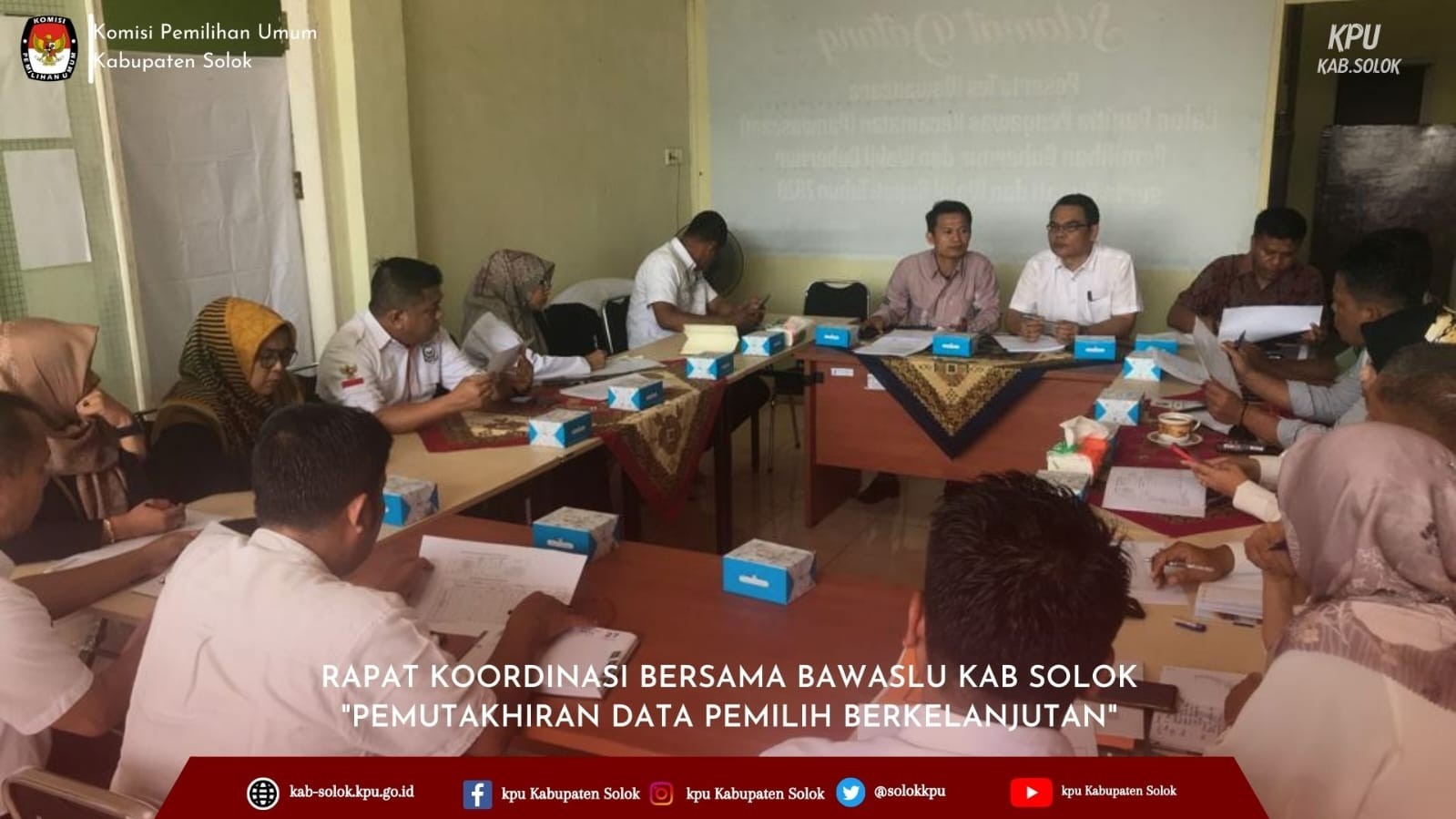 Solok, Demi terciptanya Data Pemilih yang akurat jelang Pemilhan 2024 KPU Kabupaten Solok terus berupaya memuthirkan data pemilih, KPU Kab Solok bersinergi dengan Dinas Dukcapil Kab Solok dan Juga Bawaslu Kab Solok dalam pemuthakiran data pemilih tersebut, hari ini KPU Kabupaten Solok menghadiri undangan rakor pemutakhiran data pemilih berkelanjutan di kantor Bawaslu Kab Solok 8 Juni 2022. Dalam pertemuan ini membicarakan terkait dengan tindak lanjut proses pemutakhiran data pemilih berkelanjutan di Kabupaten Solok.