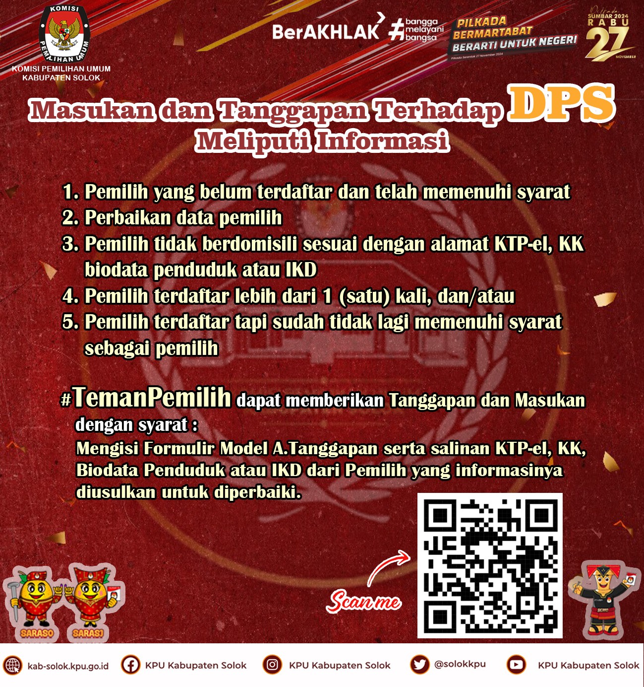 Jika kamu telah memenuhi syarat sebagai Pemilih, tapi tidak terdaftar pada DPS, ayo beri masukan dan tanggapan masyarakat kepada Panitia Pemungutan Suara (PPS) di Nagari masing-masing atau kepada Panitia Pemilihan Kecamatan (PPK) di kecamatan setempat. Masukan dan Tanggapan Masyarakat bisa disampaikan mulai dari tanggal 18-27 Agustus 2024.