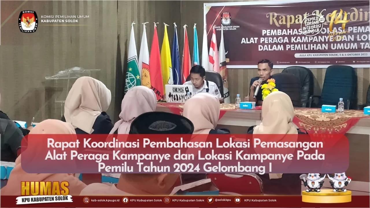 Mendekati tahapan kampanye, KPU Kabupaten Solok Kamis 5 Oktober 2023 gelar Rapat Koordinasi Pembahasan Lokasi Pemasangan Alat Peraga Kampanye dan Lokasi Kampanye dalam pemilihan Umum Tahun 2024, dengan Ketua PPK dan Ketua PPS se-Kabupaten Solok. dilaksanakan di Aula KPU Kabupaten Solok,