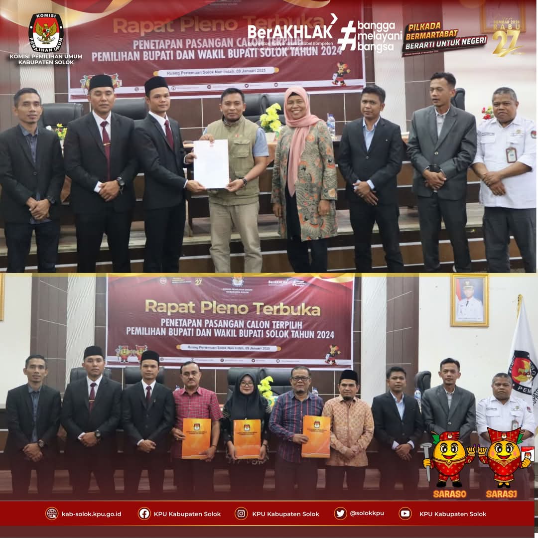 KPU Kabupaten Solok melaksanakan Rapat Pleno Terbuka Penetapan Pasangan Calon Terpilih Pemilihan Bupati dan Wakil Bupati Solok Tahun 2024 bertempat di ruang pertemuan Solok Nan Indah - Arosuka, 09 Januari 2025.