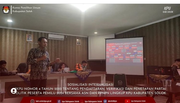 Solok, Seluruh jajaran KPU Kabupaten harus memahami dan mampu menjelaskan tahapan pendaftaran, verifikasi dan penetapan partai politik pemilu 2024. Demikian disampaikan Ketua Divisi Teknis Penyelenggaraan KPU Kabupaten Solok, Defil ketika menjadi narasumber sosialisasi Peraturan KPU Nomor 4 tahun 2022 tentang Pendaftaran, Verifikasi dan Pendaftaran partai politik peserta pemilu 2024, Jumat (29/7).