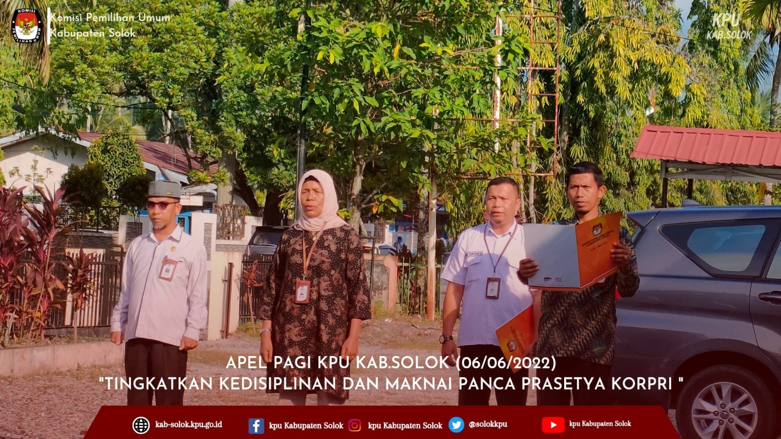 Komisi Pemilihan Umum Kabupaten Solok Senin (6 Juni 2022) melaksanakan apel pagi dihalaman kantor KPU Kabupaten Solok, diikuti oleh jajaran Komisoner, Sekretaris, Kasubbag dan Staf KPU Kabupaten Solok.
