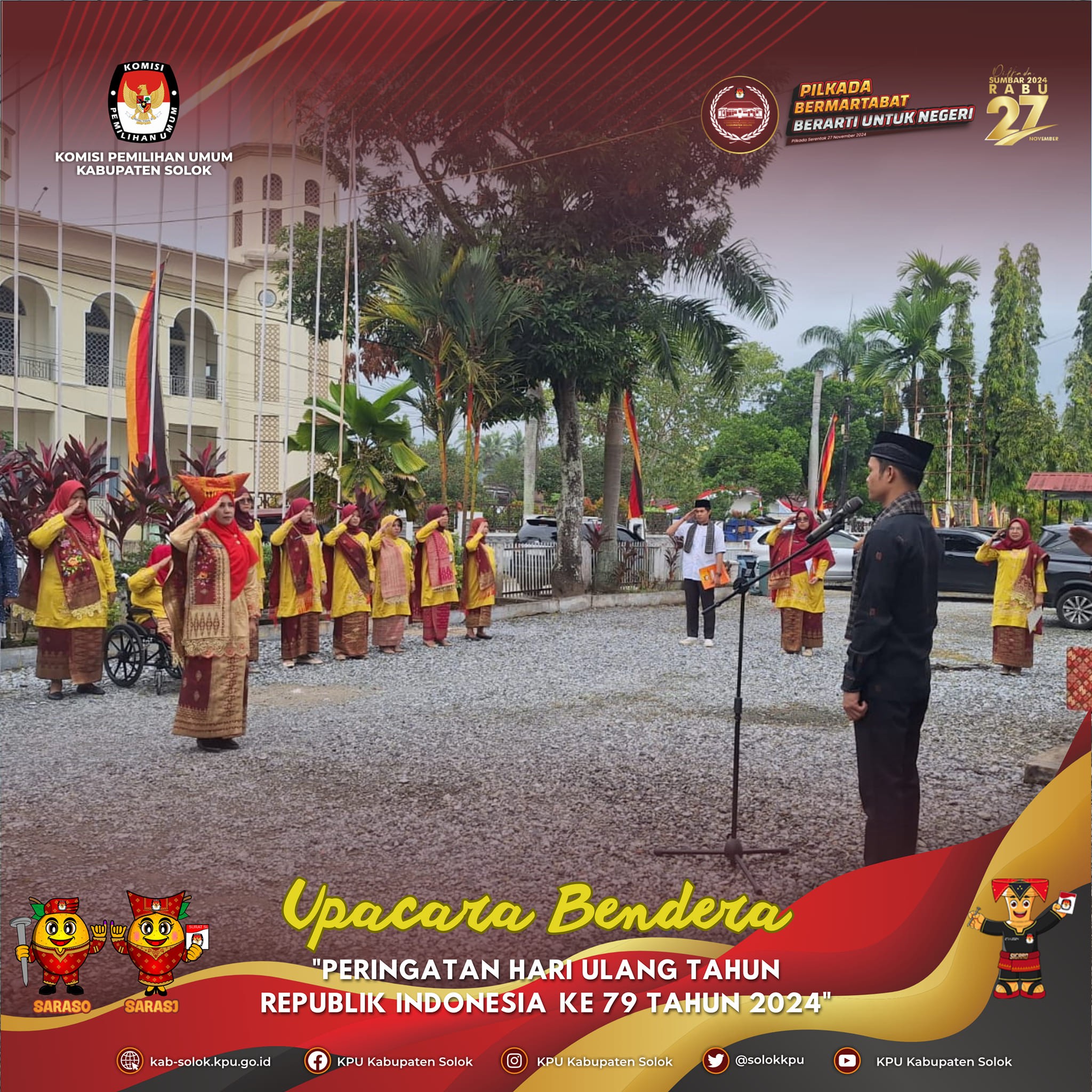 #TemanPemilih, KPU Kabupaten Solok melaksanakan Upacara Bendera dalam rangka memperingati Hari Ulang Tahun Kemerdekaan Republik Indonesia ke 79 tanggal 17 Agustus Tahun 2024 di halaman Kantor KPU Kabupaten Solok. Kegiatan ini diikuti Ketua, Anggota dan Sekretaris KPU Kabupaten Solok, Pejabat Fungsional, para Kasubbag serta staf di lingkungan KPU Kabupaten Solok.