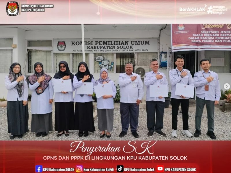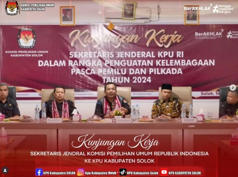 #TemanPemilih, Sekretaris Jenderal KPU melaksanakan Kunjungan Kerja Penguatan Kelembagaan Pasca Pemilu dan Pilkada Tahun 2024 ke KPU Kabupaten Solok pada Rabu, (16/7/2025). Sekretaris Jenderal KPU, Bernad Dermawan Sutrisno melalui dialog dan arahannya menyampaikan tujuan selain silaturahmi dan mengenal langsung seluruh jajaran, kunjungan kerja ini juga dilaksanakan untuk memetakan persoalan yang ada di tingkat Satuan Kerja mulai dari aspek Sumber Daya Manusia hingga Sarana Prasarana. Seluruh jajaran sekretariat khususnya para pejabat struktural dan fungsional harus menunjukan kinerja terbaik dalam menjalankan tugasnya memberikan dukungan teknis dan administratif. Para CPNS dan PPPK juga harus segera menyesuaikan ritme dalam bekerja, menerapkan kedisiplinan dan nilai-nilai organisasi dengan baik dan benar. Bernad juga menegaskan bahwa struktur organisasi KPU berada dalam satu manajemen tunggal kepegawaian. Oleh karena itu, seluruh jajaran sekretariat harus siap ditempatkan di seluruh wilayah Indonesia. Sedangkan pada aspek anggaran, Bernad mengingatkan agar seluruh jajaran mampu adaptif dan inovatif dalam melaksanakan program dan kegiatan meskipun saat ini pemerintah sedang menerapkan kebijakan efisiensi anggaran. Sesi dialog dan pengarahan ditutup dengan pesan Sekretaris Jenderal kepada seluruh jajaran untuk selalu menjaga soliditas baik dengan ketua dan anggota maupun unit kerja jajaran sekretariat. Dalam kunjugan ini juga dihadiri oleh Deputi Bidang Adminstrasi Suryadi, Kapusdatin M. Iskandar, Karo Rensi Mashur Sampurna Jaya, Karo Teknis Melgia Van Harling, Karo Umum Susmantk R Djo Naga, Sekretaris KPU Provinsi Sumatera Barat Irzal Zamzami, Sekretaris KPU Provinsi Sulawesi Barat, Sekretaris KPU Provinsi Kalimantan Utara, Sekretaris KPU Provinsi Kalimantan Tengah, Sekretaris KPU Sulawesi Tengah dan Sekretaris KPU Papua Selatan, serta Pendukung Tenaga Ahli Bapak Sekjen, Kabag Protokol, Kabag Pengembangan Karir Biro SDM, Kasubbag dan staf di bagian protokol KPU RI. #KPUMelayani #KPUKabupatenSolok