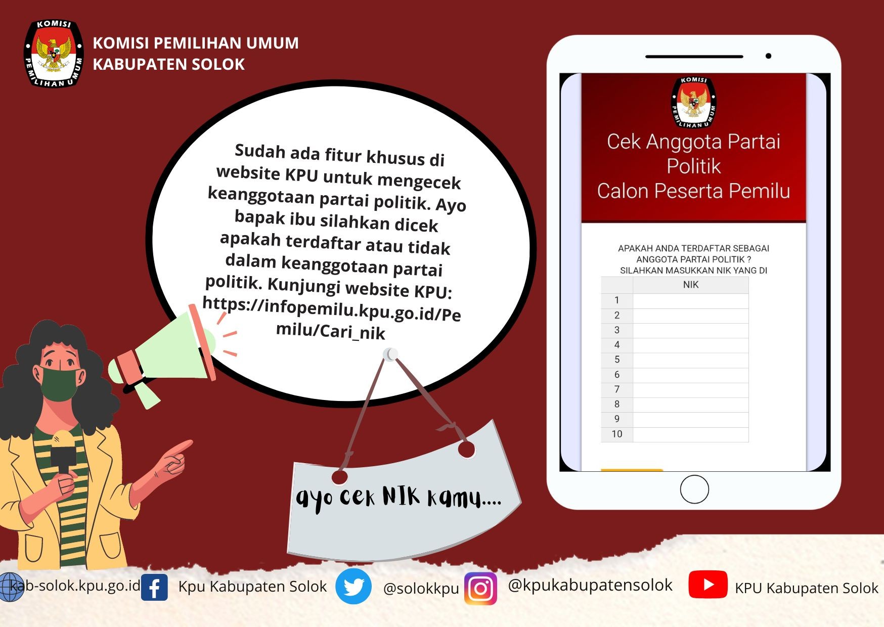 Hai Teman PemilihSudah ada fitur khusus di website KPU untuk mengecek keanggotaan partai politik. Ayo pastikan bapak ibu terdaftar atau tidak dalam keanggotaan partai politik. Kunjungi website KPU: https://infopemilu.kpu.go.id/Pemilu/Cari_nik