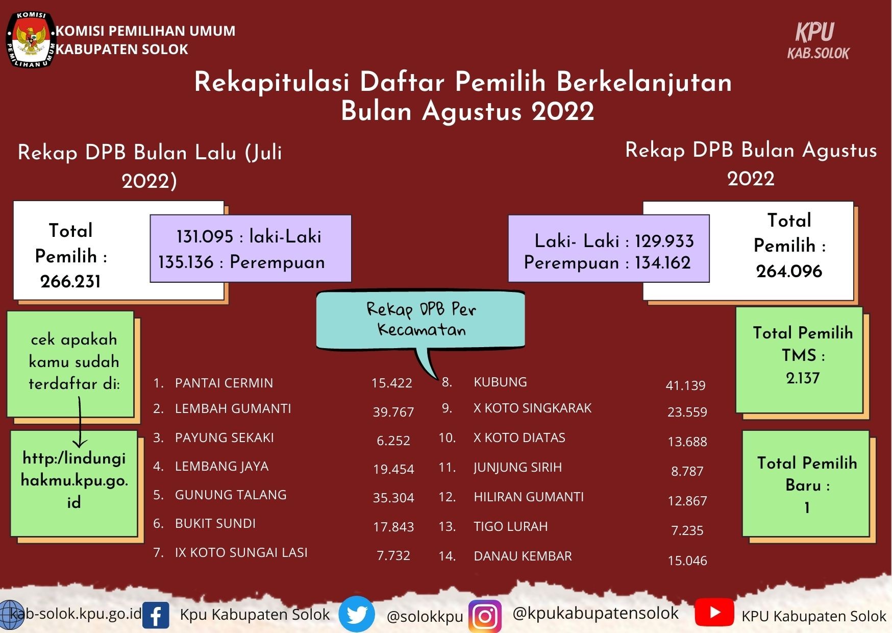Hai Teman Pemilih berikut infografis rekap daftar pemilih berkelanjutan bulan Agustus Tahun 2022 . Jangan lupa untuk mengecek apakah kamu sudah terdaftar sebagai pemilih pada link berikut. http://lindungihakmu.kpu.go.id