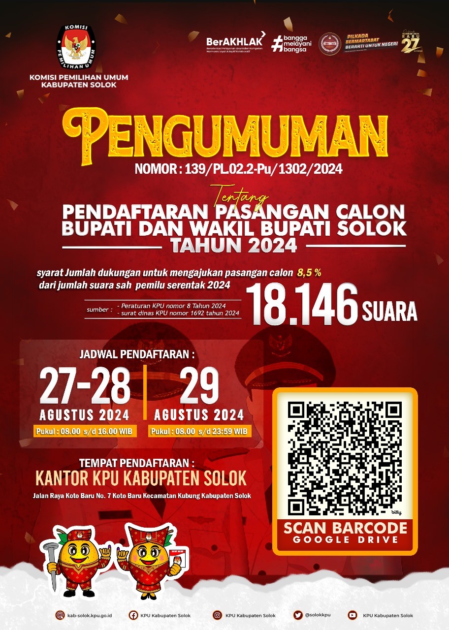 KPU Kabupaten Solok telah melakukan rekapitulasi masukan dan tanggapan masyarakat yang diterima pada tahapan tanggapan masyarakat tanggal 15 s.d 18 September 2024, terhadap keabsahan persyaratan Pasangan Calon Bupati dan Wakil Bupati Solok Tahun 2024 dengan hasil NIHIL, berikut rincian Berita Acara;