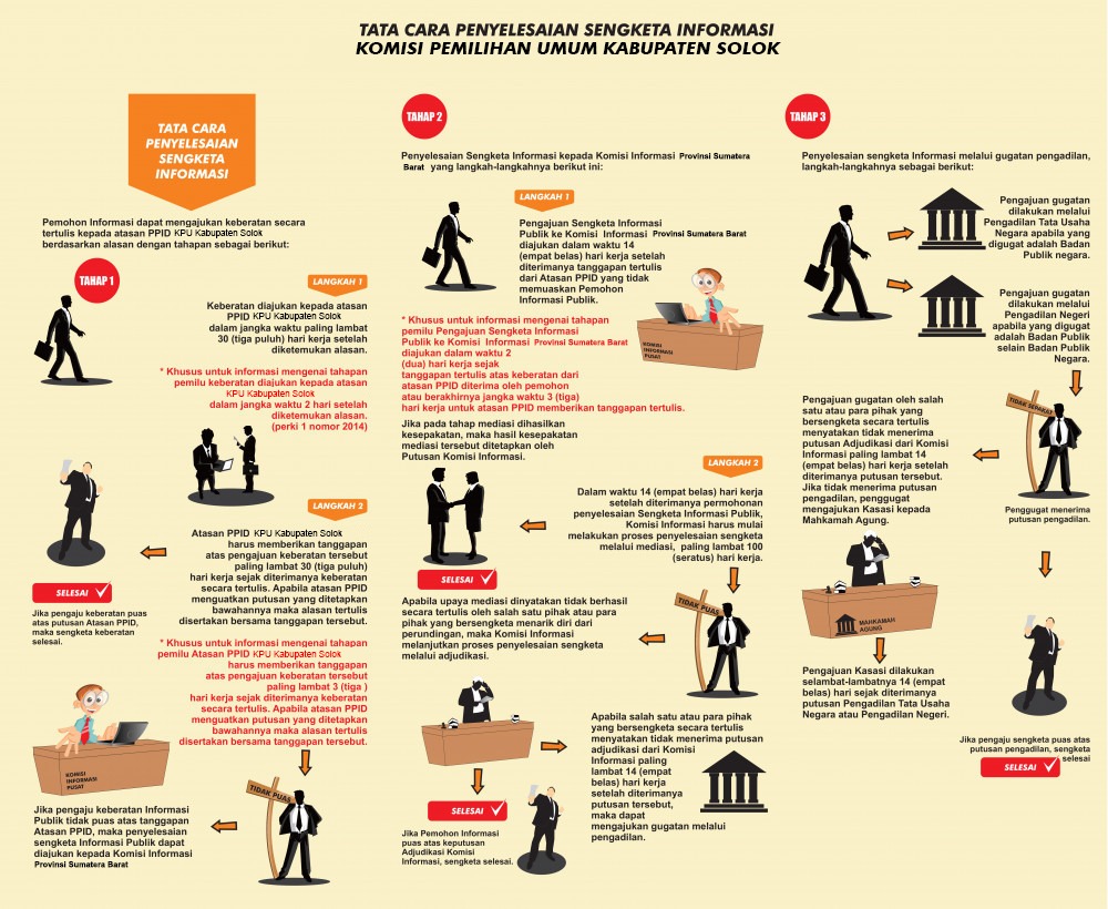 - Apabila Pemohon Informasi tidak puas dengan keputusan Atasan PPID, maka pemohon informasi dapat pengajukan Upaya penyelesaian Sengketa Informasi Publik diajukan kepada Komisi Informasi dalam waktu paling lambat 14 (empat belas) hari kerja setelah diterimanya tanggapan tertulis dari atasan PPID.